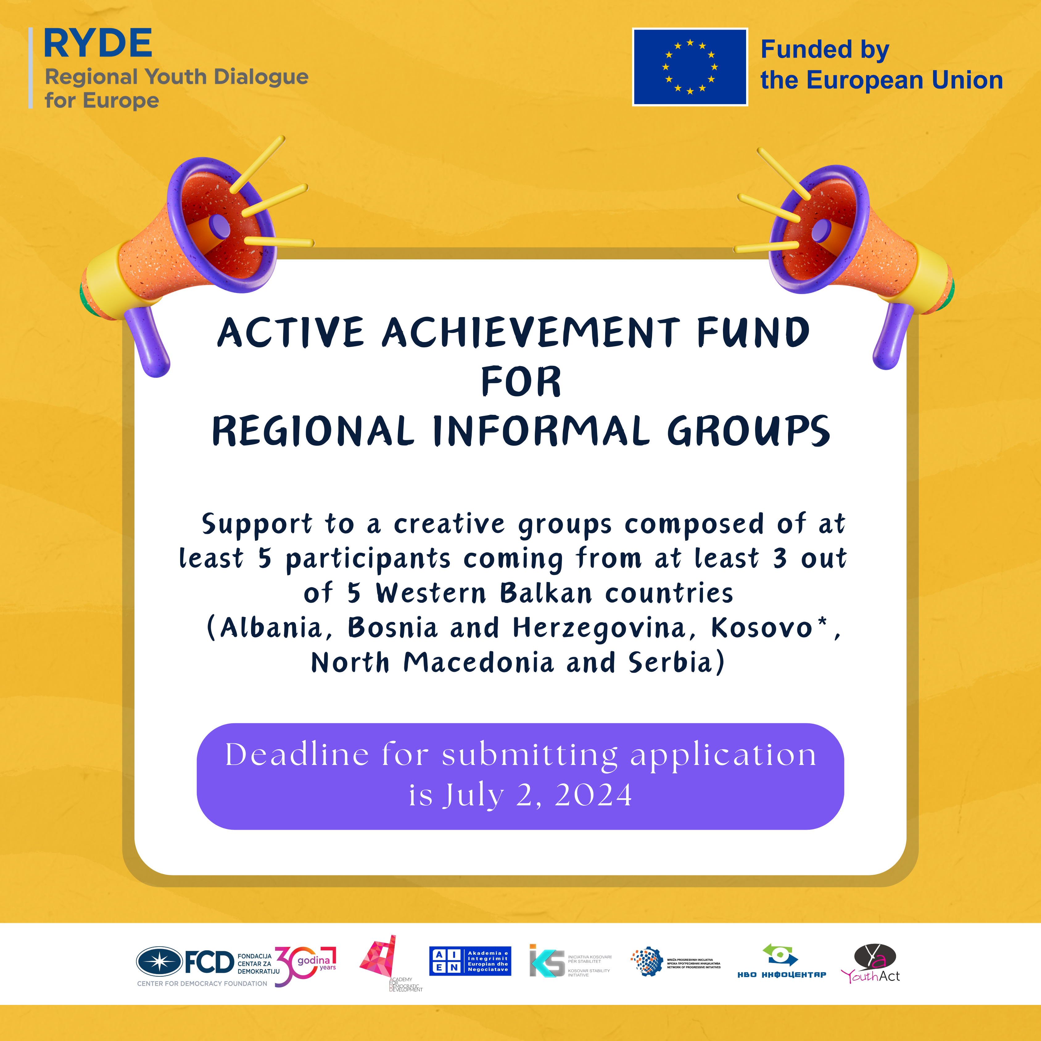 Zvanično je otvoren Poziv za prijedloge projekata u okviru Active Achievement Fonda za regionalne neformalne grupe, kao dio projekta Regionalni dijalog mladih za Evropu, koji finanasira Evropska Unija. Osnovni cilj Poziva je